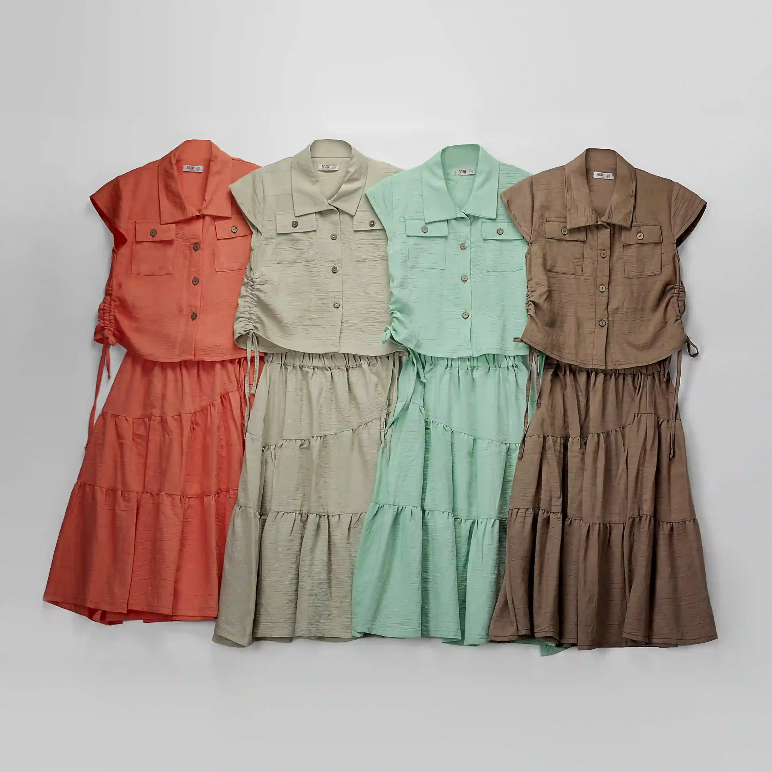 قد بلوز از گردن55.5 سانت- عرض سینه95.5 سانت- قد آستین10.5 سانت- دور کمر98.5 سانت- قد دامن با کمر79.5 سانت-