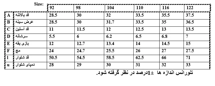 قد بالاتنه/32-عرض سینه/31.7 –قد آستین/12-قد شلوار/58.5