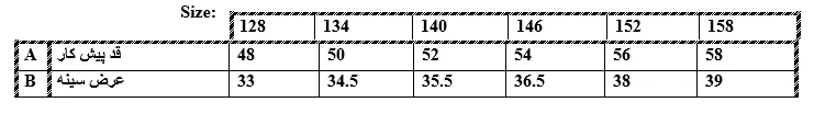 | سایز | 128-(7 تا 8 سال), 134-(8 تا 9 سال), 140-(9 تا 10 سال), 146-(10 تا 11 سال), 152-(11 تا 12 سال), 158-(12 تا 13 سال) |