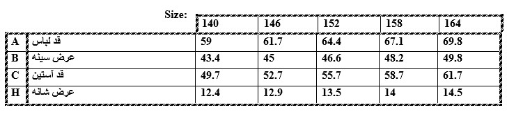 | سایز | 122-(6 تا 7 سال), 140-(9 تا 10 سال), 146-(10 تا 11 سال), 152-(11 تا 12 سال), 158-(12 تا 13 سال), 164-(13 تا 14 سال) |